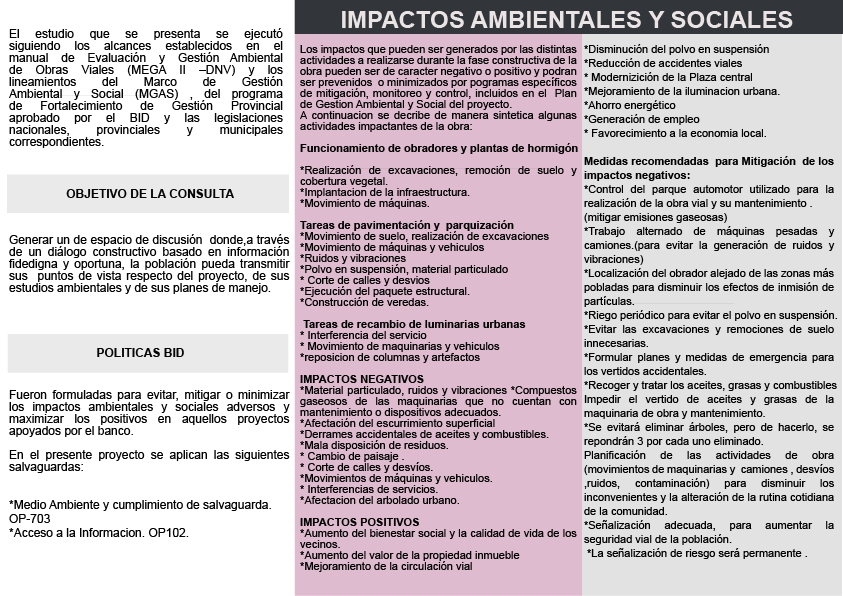 La Dirección de Vialidad Provincial, el Ministerio de Obras Públicas de la Nación y el Banco Interamericano de Desarrollo- BID, convocan a las personas físicas o jurídicas, públicas o privadas; estatales o no, potencialmente afectadas por la implementación del Proyecto, organizaciones no gubernamentales y público en general, a participar en la Consulta Pública Virtual el día 11 de mayo a las 10 hs. en la página de Facebook de la Dirección de Vialidad (https://www.facebook.com/dvpchaco), donde se pondrá a consideración de los sectores involucrados, el proyecto de Consolidación de Territorio Urbano Equitativo y Ambientalmente Sustentable en la localidad de Las Palmas, Provincia del Chaco. Contamos con su participación.